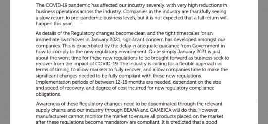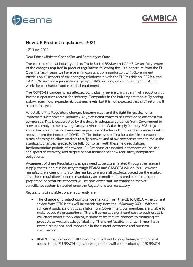 BEAMA GAMBICA letter to UK Government – New UK Product regulations 2021